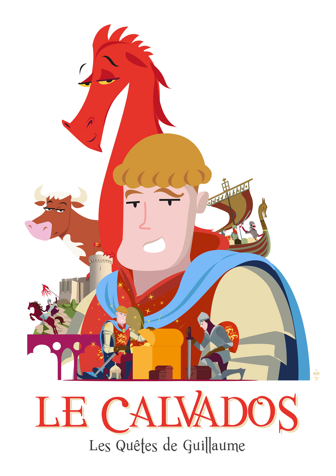 J’ai illustré les lieux incontournables du département et accompagné des événements particuliers : l’anniversaire de la Bataille d’Hastings et les fêtes estivales de Normandie. Pour ces événements médiévaux, la commande couvrait un spectre large — illustrations thématiques, goodies, jeux, fonds d’écran, émoticônes et gifs animés.